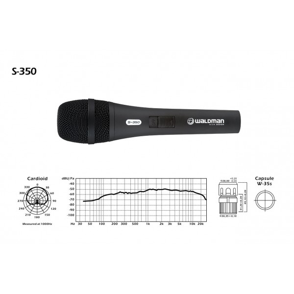A escolha perfeita para quem necessita de microfones extremamente profissionais para VOCAL. O WALDMAN S-350 (linha STAGE) é um microfone dinâmico cardióide de reprodução clara e alta presença, com construção metálica rígida e robusta para aguentar “qualquer situação de uso”. Seguindo o padrão da indústria europeia (U.S.A. Design com padrão Alemão de captação) e, diferentemente dos outros microfones com aplicações variadas, o S-350 foi desenvolvido exclusivamente para atividades VOCAIS, sejam para uso em palcos profissionais (ao vivo), ensaios, cultos, palestras ou até mesmo em gravações de estúdio. No quesito palestras e afins, o S-350 se tornou padrão e referência.