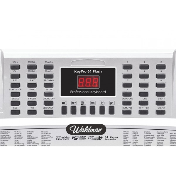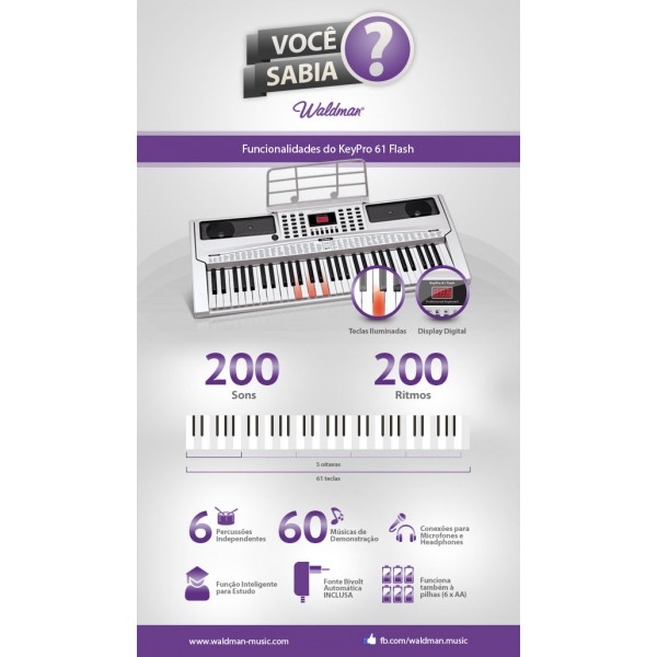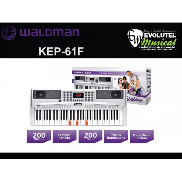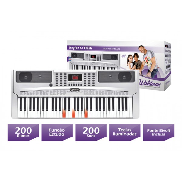 Teclado Musical Profissional WALDMAN KeyPro Flash de 61 teclas iluminadas, 200 sons, 200 ritmos, Função Estudo, Fonte Bivolt mod. KEP-61F