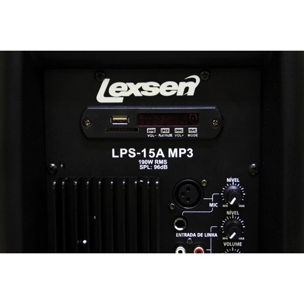 A LPS-15A MP3 é uma caixa ativa com equalizador de 2 bandas que auxilia na equalização, e conector Speakon para alimentação de uma caixa passiva. Possui entradas XLR e P10 (TR), entrada de linha XLR e RCA, saída de linha XLR e P10 (TR) e entrada USB e SD Card. A Caixa dispõe das funções MP3 Player, conta com um display de LCD, receptor de sinal FM, função de Bluetooth para transferência e reprodução em RealTime de arquivos em MP3, controle remoto que possibilita o controle de músicas e volume a distância, entradas em USB e SD Card que permitem a maior flexibilidade e compatibilidade de arquivos de áudio. A qualidade do aparelho aliada a quantidade de funções possibilitadas por ele, combinados com a força de inserção no mercado, estes são os fatores de principal destaque desta Caixa. Isto faz com que o cliente escolha a Caixa Lexsen em preferência a concorrência.