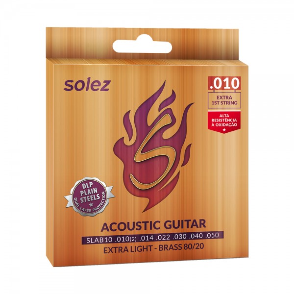As cordas de violão aço Brass 80/20 (SLAB) da Solez contam com as primas com DLP (Dual Layer Protection) e bordões com Brass 80/20 de material de recobrimento. Este material dos bordões apresentam timbre vívido, bem equilibrado com ótimo brilho. A durabilidade varia de acordo com o cuidado e sudorese do músico. Com o limpador de cordas Solez você consegue prolongar bastante a vida do encordoamento, com ótimo timbre e adiando bastante a oxidação natural do Brass. As primas DLP também contribuem na luta contra a oxidação do Brass, já que não contaminam os bordões e evitam o envelhecimento precoce dos bordões.