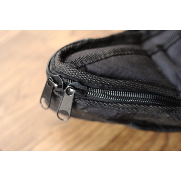 Em nylon PVC 600, almofadada com espuma de 2 centímetros de alta densidade, forrada com courino especial e/ou acoplado aveludado de 5 mm, intertelada de E.V.A nas laterais e papelão 40 no corpo para maior proteção do instrumento. Alças manuais e tiracolo de polietileno 45 mm com alta resistência e mosquetoes.