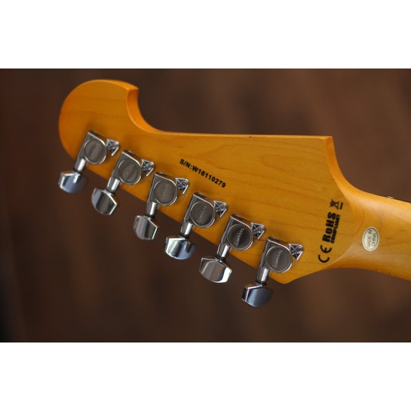 A S1B é guitarra Washburn com corpo em Basswood, braço em Maple e escala em Rosewood. O modelo conta com 22 trastes com marcação Dot, Headstock invertido, captação Silgle S/S/S. Além de possuir chave seletora de 5 posições, 1 volume e 1 tone e Tarraxas Chrome Diecast.