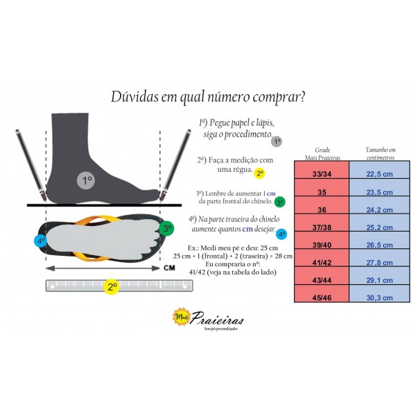 As tintas utilizadas são específicas e testadas para impressão na sandália Mais Praieiras, e a durabilidade da impressão digital é superior às demais existentes no mercado.