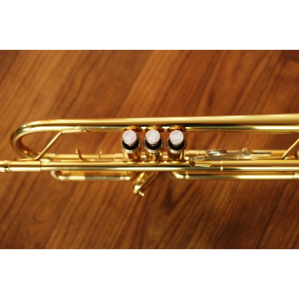 Este trompete possui 3 válvulas em aço inoxidável com botões arredondados, bocal 7C, anel regulável e dedeira 1ª curva, que oferecem ao músico maior conforto na hora de tocar.