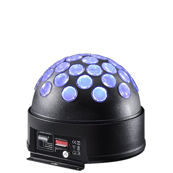Velocidade de rotação e strobo ajustáveis via dip switch.