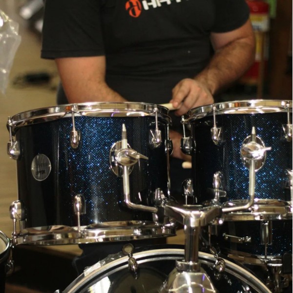 Possui bumbo 20x16" (aros de madeira) e pés de bumbo telescópico.