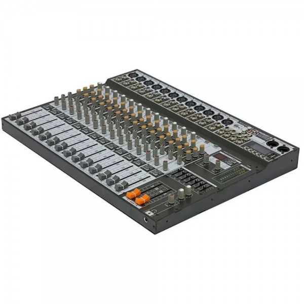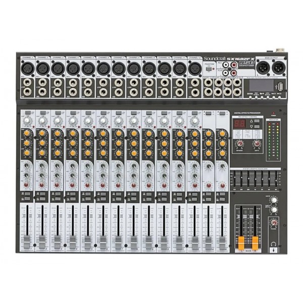 A mesa de som SoundCraft SX 1602 FX USB é um mixer analógico de última geração, que agora conta com reprodução de arquivos em MP3 via USB. Possui 16 canais, sendo 12 para entrada mono XLR, 2 canais com entradas estéreo e mais 2 auxiliares.