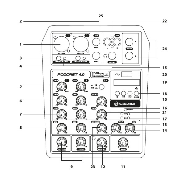 Atende às necessidades de produções em home-studio, streaming, etc. Possui Phantom Power (48V) integrado para a alimentação direta de microfones condensadores.